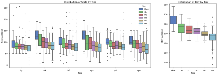 Boxplots are used to show the distribution of data by category. The box shows the interquartile range (25th percentile to 75th percentile), the line in the box shows the median, and the points above and below the whiskers show outliers. The top whisker represents the largest data point within 1.5 times the interquartile ranges of the box, similarly the bottom whisker shows the smallest data point within 1.5 interquartile ranges of the box. I find them more useful than violinplots or boxenplots because boxplots show useful statistical information (interquartile, median, etc.). Below is a chart showing the distributions of various stats by tier on the left, and the distribution of the BST by tier on the right.