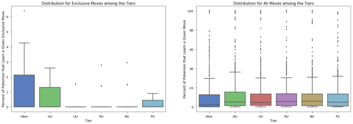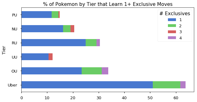 This graphic gave me a general intuition about how common and rare moves are distributed among tiers. In particular, I learned that the Uber tier hogs many moves, likely due to having a lot of legendary Pokemon. To the reader, however, this graphic does not show any clear message. To communicate this idea, I would use the below plot, showing the percentage of Pokemon that learn at least one exclusive move by tier: