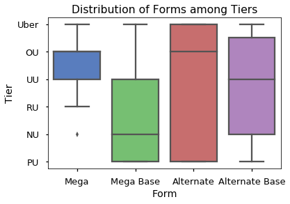 Since I knew the variance was so high relative to the median, I should have used a point plot instead. Another example is when I visualized the distribution of forms among the tiers: