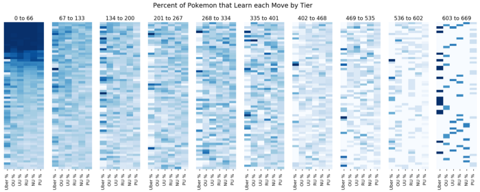 I touched on this idea briefly when talking about boxplots. Many visualizations give too much information which can obscure your main message. The extra information is key for data exploration, but can get in the way when you try to explain your data to others. For example, below is a visualization of how the moves are distributed by tier. Each row represents a move, and the darkness of the box shows what percentage of Pokemon within that tier learn that move. The moves are ordered by most common to least common.