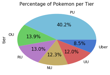 After working with this dataset and reading articles online, I found pie charts were not useful for comparing proportions. Below is a pie chart I used to see the distribution of Pokemon among the tiers: