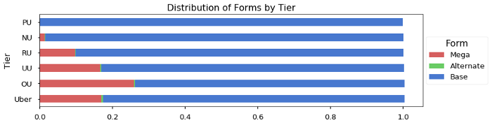 I almost always prefer a stacked bar chart, such as the one I used to show the distribution of types earlier in this article. Below is another example where I compare the distribution of forms by tier: