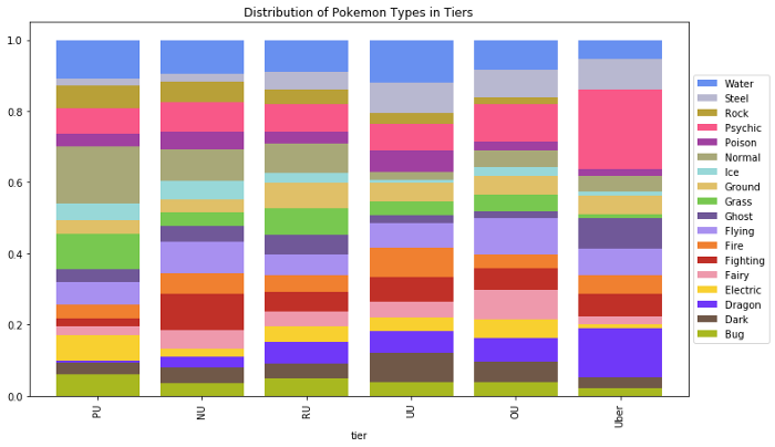 It’s easy to create visualizations and understand the data on the surface level, but I found it far more insightful to think about causes at every step. For example, below is a visualization of the distribution of types by tier.